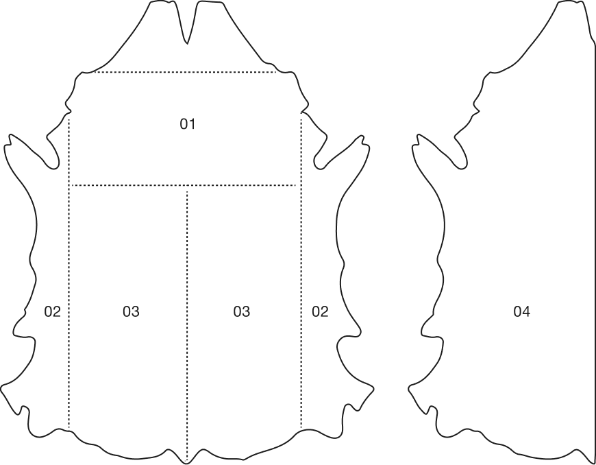 Can be either a single bend (one half) or a double bend (both sides) Usually used for belts, footwear + accessories. 04 SIDE Includes the belly, bend, shoulder and neck. Usually used for belts, footwear, garments and accessories.